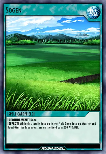 [REQUIREMENT] None [EFFECT] While this card is face-up in the Field Zone, face-up Warrior and Beast-Warrior Type monsters on the field gain 200 ATK/DEF.